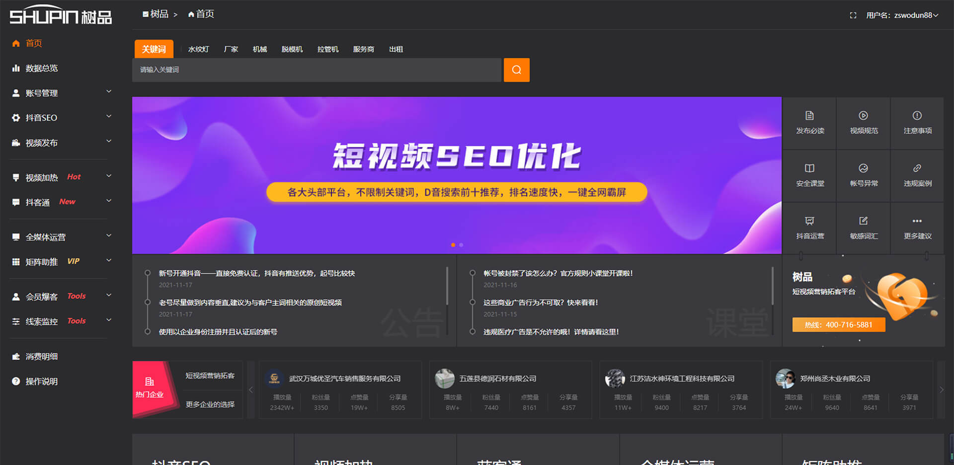 幫助企業(yè)解決在短視頻營銷中的內(nèi)容生產(chǎn)、賬號(hào)搭建、賬號(hào)運(yùn)營 、精準(zhǔn)低成本引流、業(yè)務(wù)場(chǎng)景、服務(wù)場(chǎng)景、服務(wù)效率等問題的短視頻營銷拓客平臺(tái)。